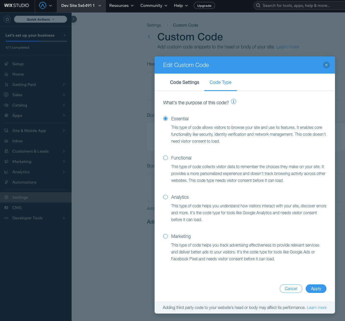 - In the Code Settings tab, paste the following code: